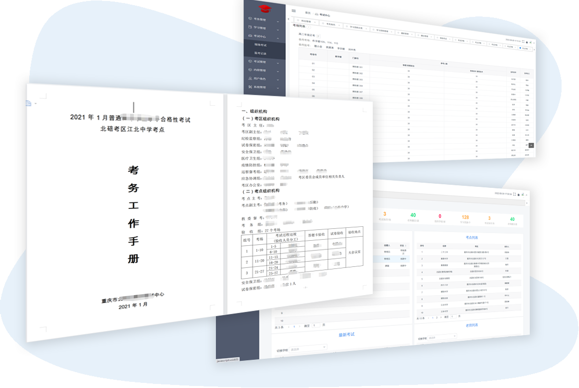 - 快捷的考場生成和安排功能,可幫助考式中心、考點(diǎn)快速安排考場和監(jiān)考老師。